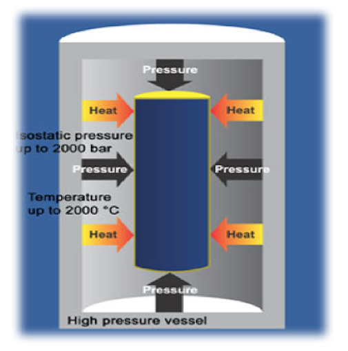 Beim heißisostatischen Pressen (HIP) wird das Produkt in einen geschlossenen Behälter gegeben, mit Inertgas gefüllt und bei sehr hoher Temperatur (in der Regel nahe der Schmiedetemperatur des Materials) und sehr hohem Druck (in der Regel 100-140 MPa) gesintert oder verdichtet. Dadurch kann das Produkt gesintert oder verdichtet werden. Bei metallischen Werkstoffen kann mit der Technologie des heißisostatischen Pressens eine Verdichtung zur Beseitigung von Fehlern erreicht werden, da metallische Werkstoffe bei hohen Temperaturen eine sehr geringe Festigkeit und eine ausgezeichnete Plastizität aufweisen, das Metall im Bereich des Lochs einem externen Gasdruck ausgesetzt ist und eine plastische Verformung stattfindet, das Metall im Bereich des Lochs miteinander in Kontakt steht und die metallurgische Struktur das Loch verschwinden lässt.